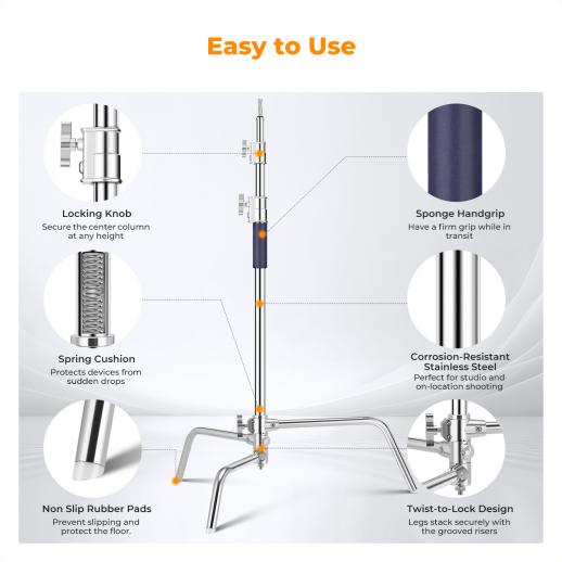 The K&F Concept 3.3 m Heavy‑Duty C‑Stand KF34.037 is built for the most demanding shoots. Crafted with stainless steel legs and a removable crossbar with boom arm, it supports up to 20 kg and extends from 1.49 m to 3.3 m. Ideal for lighting, modifiers, and seamless on-location or studio use.
