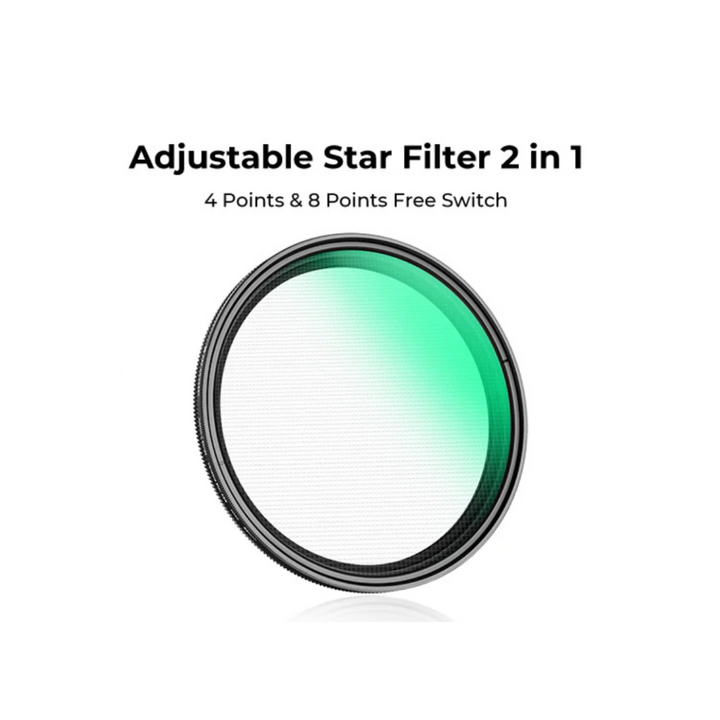 The K&F Concept Variable Star Filter lets you switch between 4-point and 8-point starburst effects by simply rotating the filter ring. Ideal for adding cinematic sparkle to lights, reflections, and highlights in photography and video. Built with premium optical glass and a slim rotating frame for smooth control and image clarity.