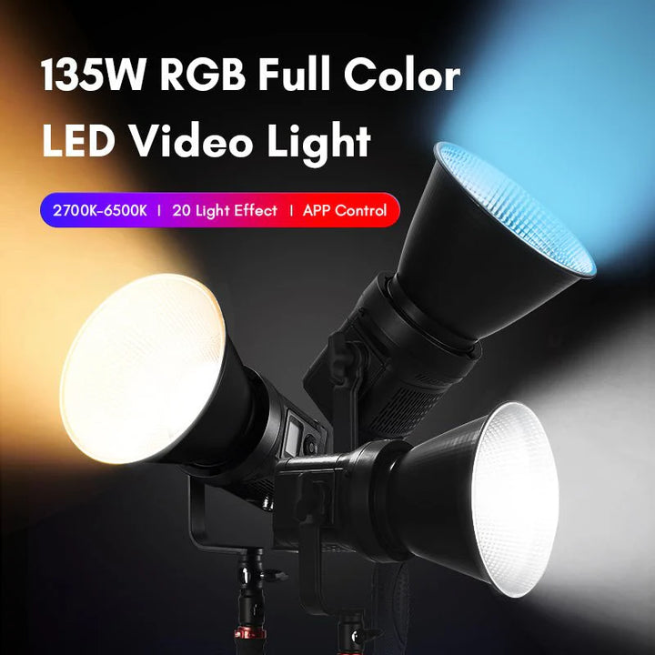- 135 W COB output, high color accuracy CRI ≥ 97 / TLCI ≥ 98 Bi‑color 2700–6500 K + full RGB (Hue 0–360°) via app control