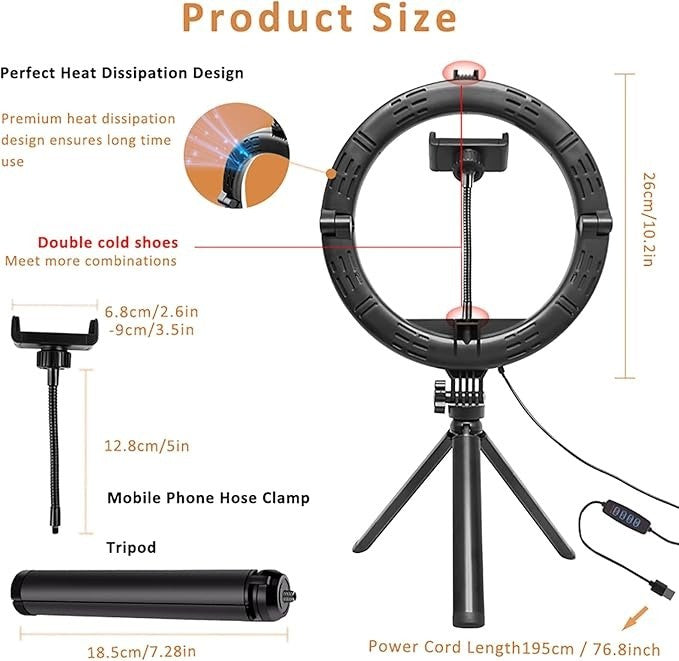 A compact USB-powered 10″ ring light ideal for vloggers, makeup tutorials, TikTok content, and tabletop shooting. Produces soft, even lighting and enchanting catch-lights in the subject’s eyes.
